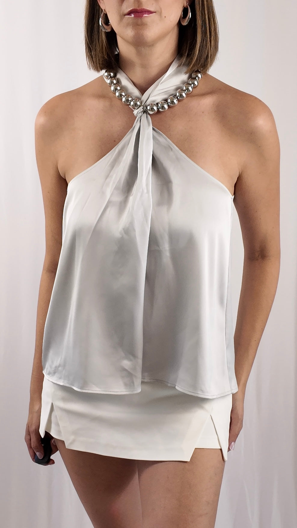 Expertly crafted with a halter neckline, this satin tank top is adorned with shimmering metallic silver beading, adding a touch of elegance and glamour to any outfit. Made with quality materials and attention to detail, this top is the perfect choice for both formal and casual occasions. Fits true to size.