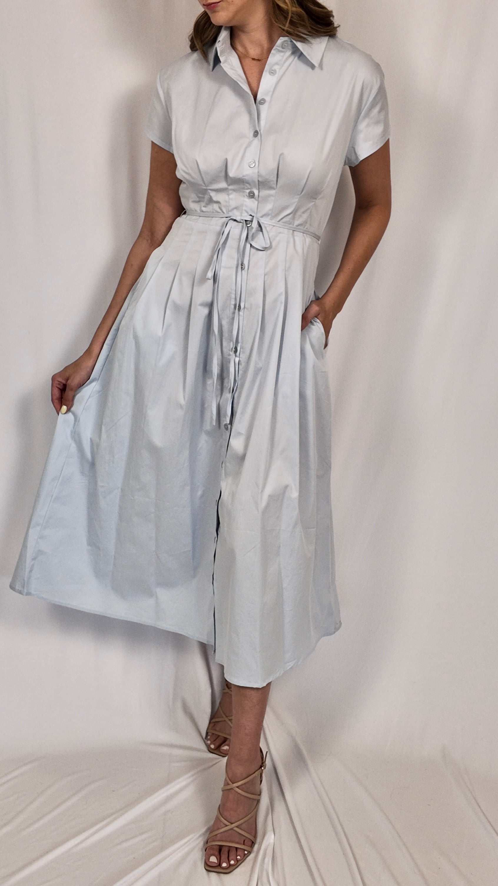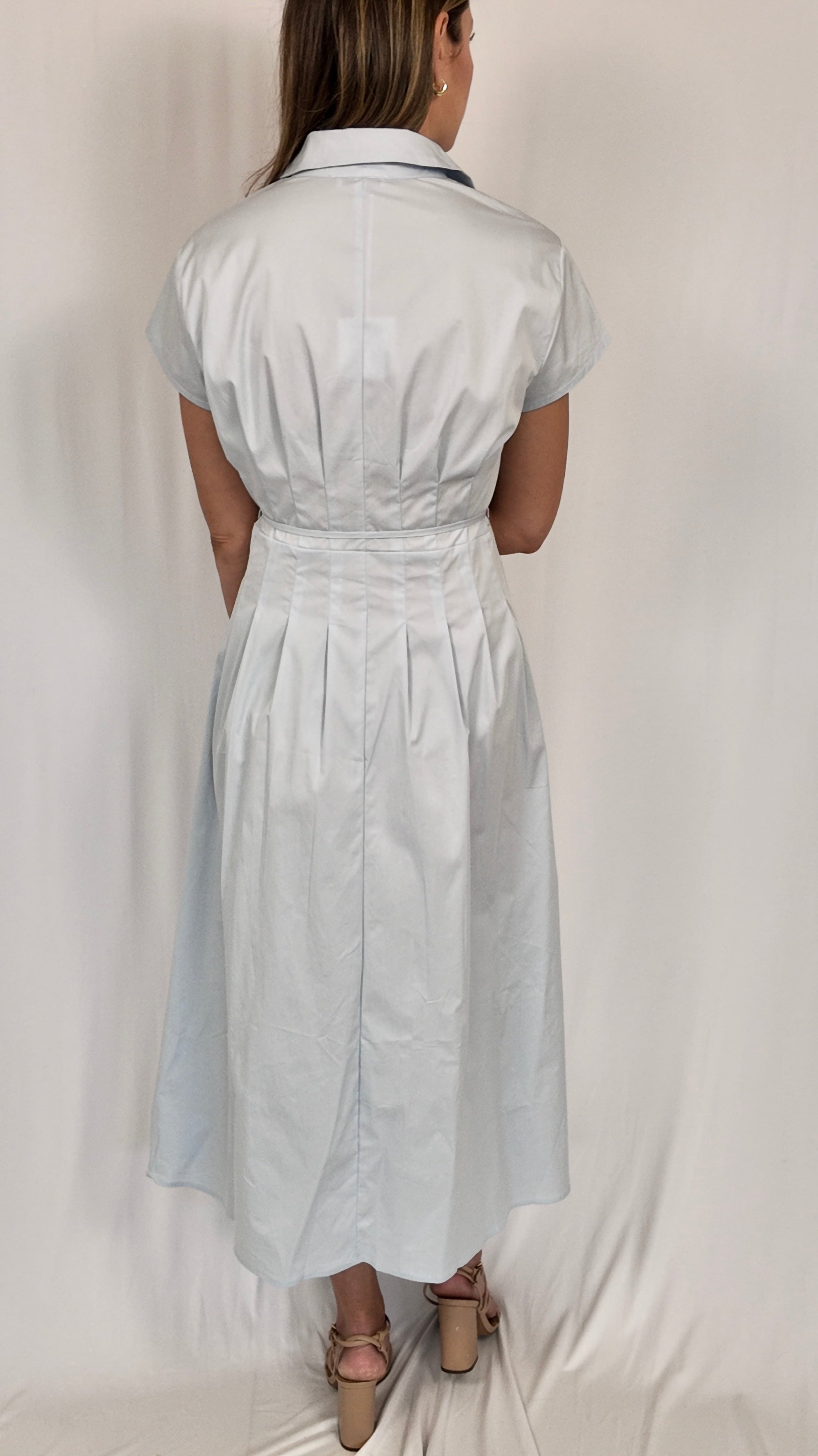 The Cambridge Poplin Shirt Dress offers a sharp, tailored midi silhouette with a polished finish. It showcases a classic collared neckline, short sleeves, and vertical seam accents, complemented by a coordinating tie belt and button-front closure. Crafted from a blend of 65% cotton, 32% nylon, and 3% spandex, this dress is an adaptable choice for sophisticated daytime looks.