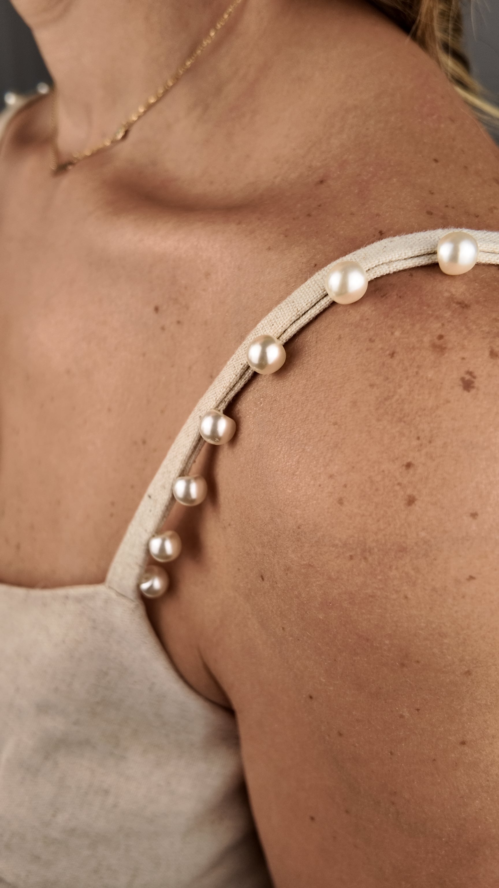 This stylish set is made from a breathable linen-cotton blend, offering both comfort and elegance. Subtle pearl embellishments along the straps and hemline provide a refined, feminine touch. With a relaxed fit, this adaptable piece complements high-waisted trousers or your favorite denim effortlessly. Fabric composition: 70% cotton, 30% linen. Runs small, you may size up.