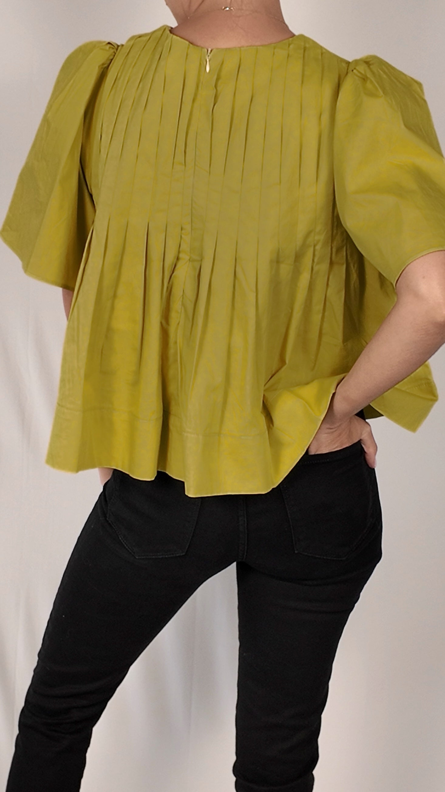 This pleated top features a round neckline, flared short sleeves, and a semi-cropped babydoll fit. It is lined and has a hidden zipper at the back, made from 100% cotton for comfort.