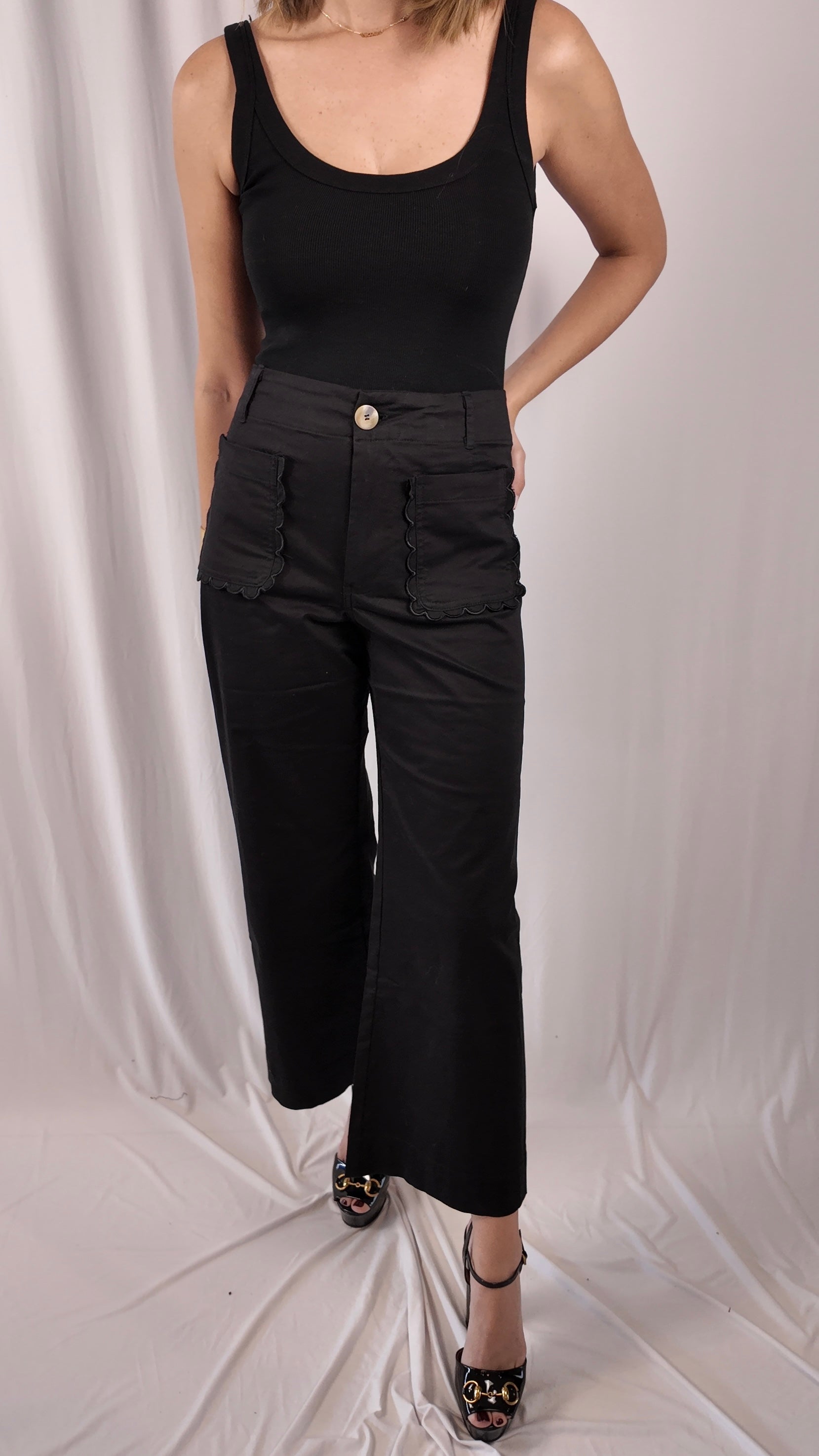 These straight-leg pants showcase large front patch pockets adorned with scalloped edges, complemented by back patch pockets, belt loops, and a button zip closure. Crafted from a blend of 97% cotton and 3% spandex, they combine comfort with a refined yet playful style perfect for daily wear.